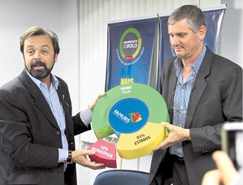 O movimento dos prefeitos gaúchos em defesa da distribuição mais justa da arrecadação com impostos marcará a sexta-feira com uma série de protestos pelo Estado. Ontem, o presidente da Famurs, Luiz Folador (E), mostrou uma maquete simbolizando a divisão de recursos entre os três entes da federação. Hoje, municípios ficam com 18% do dinheiro obtido com impostos, Estados, com 25%, e a União, com 57%.
